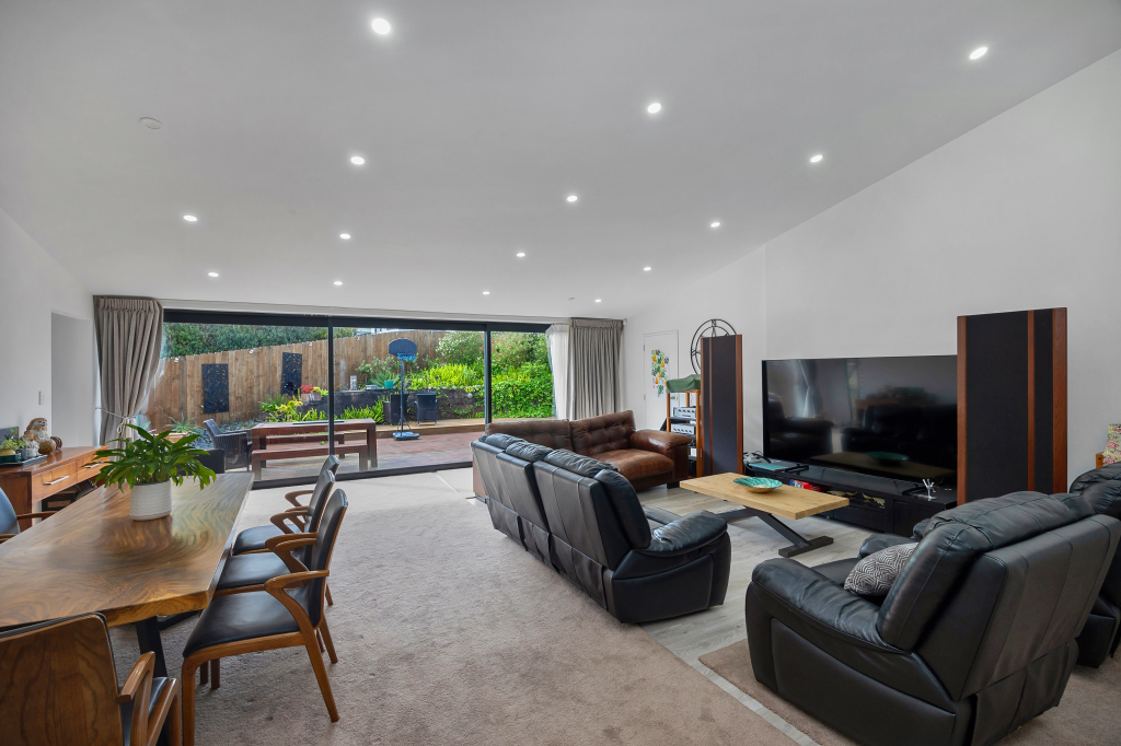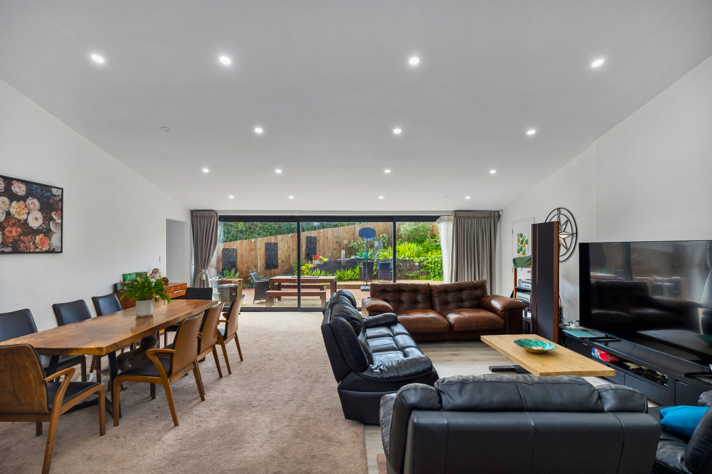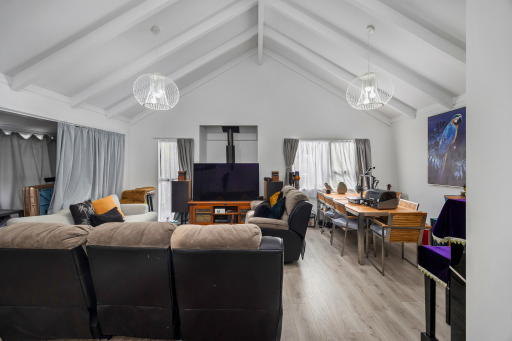 - Light-filled open-plan living with striking pitch ceiling
