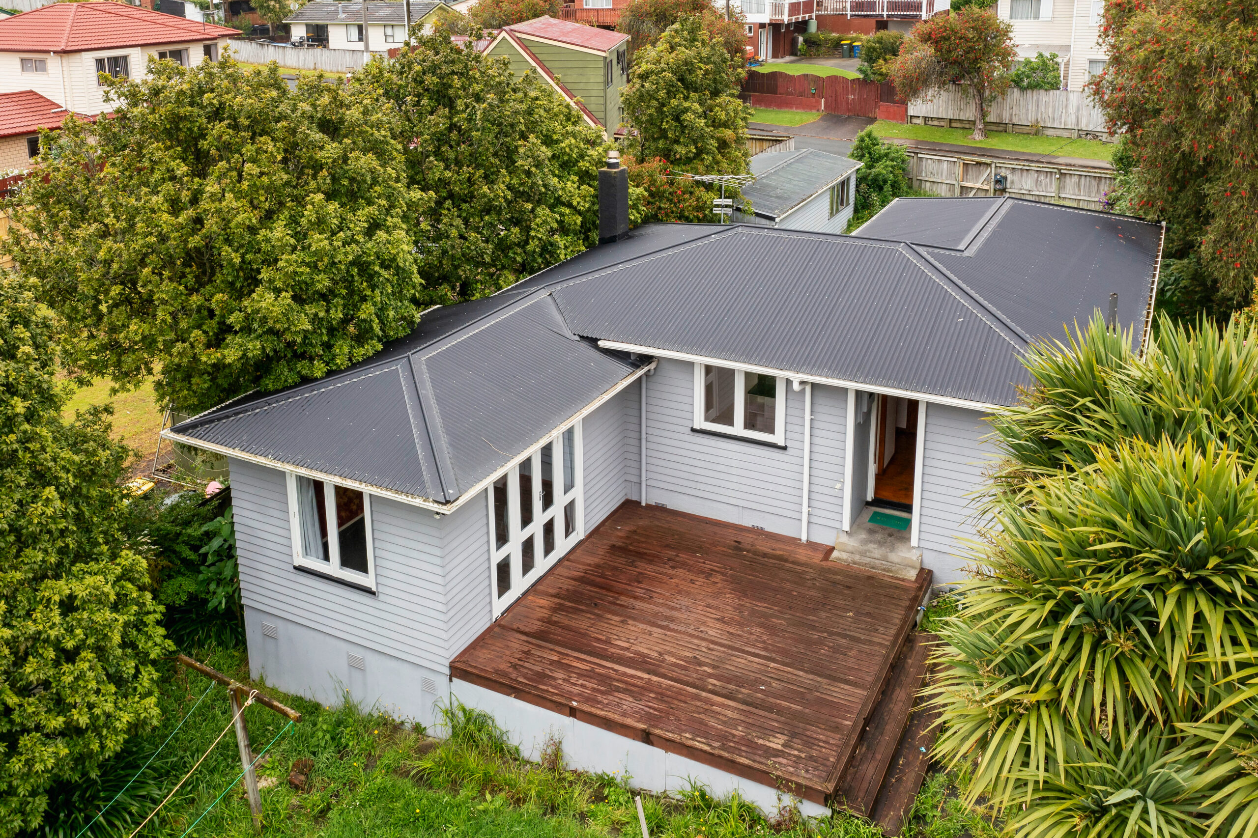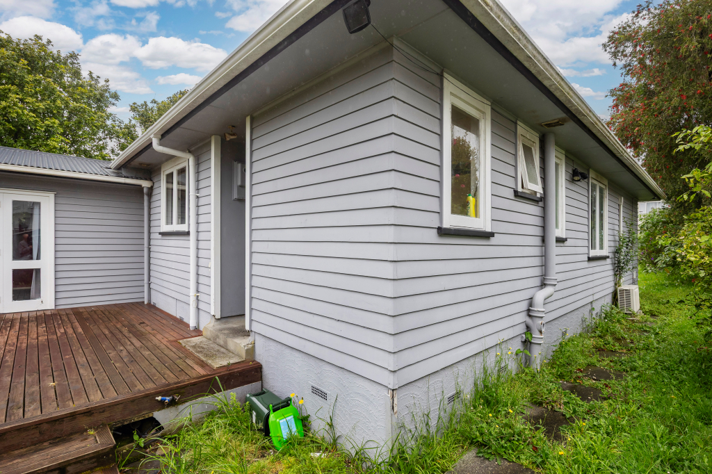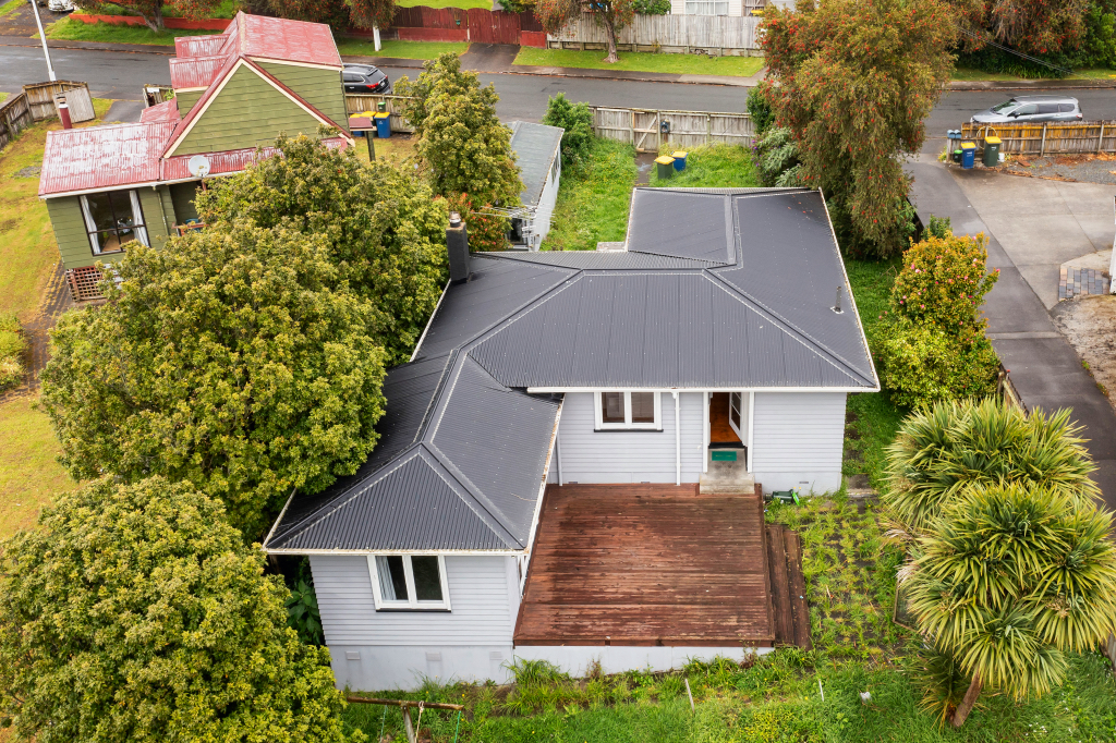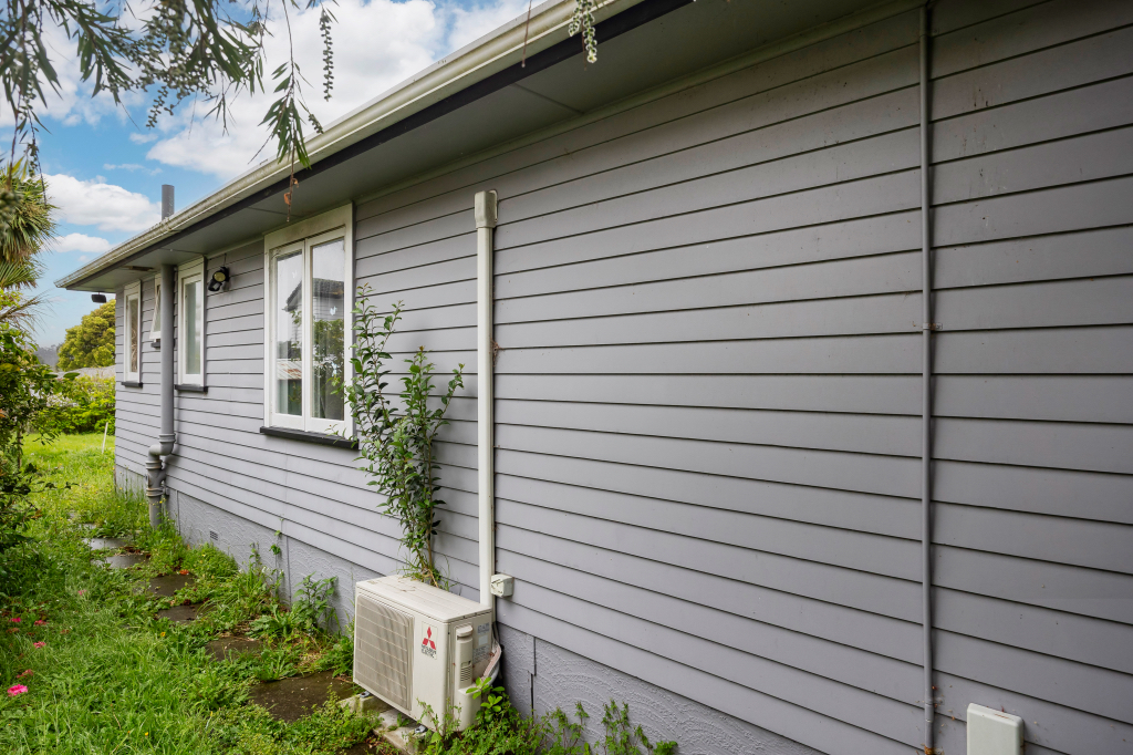 - Weatherboard cladding, wooden joinery, and iron roof